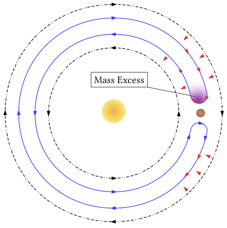 If this radial inward motion is then rapid enough to enter the “horseshoe streamlines” this leads to a strong asymmetry in the horseshoe region. When gas enters the co-rotation region in front of the planet, it performs a horseshoe orbit and moves towards the planet. At the U-turn point of the horseshoe orbit an excess of mass occurs. While the gas turns its direction at this point, it moves closer to the star and loses angular momentum which is transferred to the planet.
